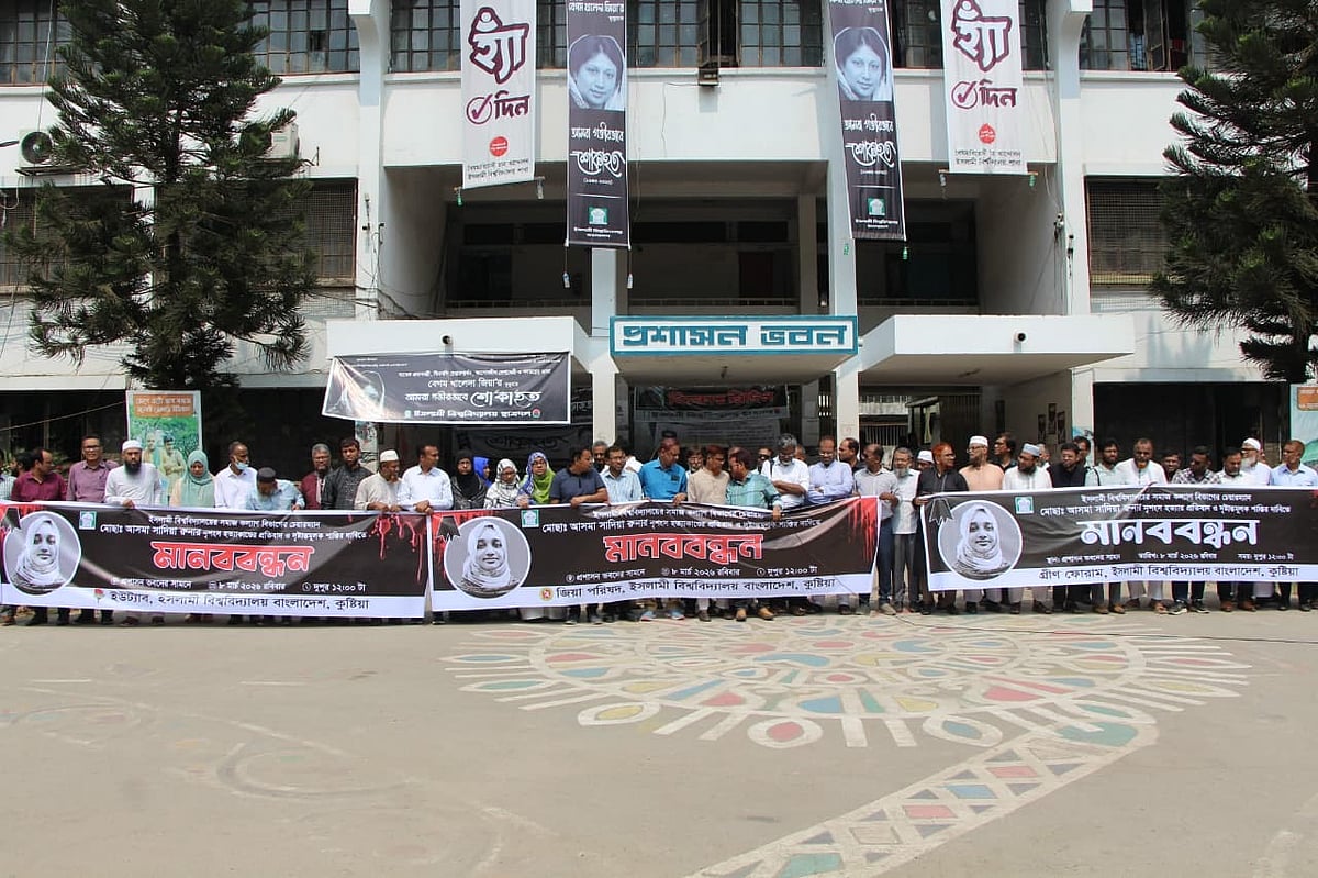 ইসলামী বিশ্ববিদ্যালয়ের (ইবি) সমাজকল্যাণ বিভাগের সভাপতি ও সহকারী অধ্যাপক আসমা সাদিয়া রুনা হত্যাকাণ্ডের বিচারের দাবিতে মানববন্ধন করেছে বিশ্ববিদ্যালয়ের শিক্ষকদের কয়েকটি সংগঠন। আজ রোববার বিশ্ববিদ্যালয়ের প্রশাসন ভবনের সামনে এ মানববন্ধন অনুষ্ঠিত হয়। এতে বিএনপিপন্থী শিক্ষকদের সংগঠন জিয়া পরিষদ, ইউনিভার্সিটি টিচার্স অ্যাসোসিয়েশন অব বাংলাদেশ (ইউট্যাব), জামায়াতপন্থী শিক্ষক সংগঠন গ্রিন ফোরামের শিক্ষকদের পাশাপাশি আসমার স্বামী ইমতিয়াজ সুলতান ও তাঁর চার শিশুসন্তানও ছিল। ইমতিয়াজ ছোট্ট মেয়ে আয়েশা জান্নাতকে কোলে নিয়ে ছিলেন। তিনি বক্তব্যে আসমার জন্য সবার কাছে ক্ষমা চান এবং দোয়া কামনা করেন।